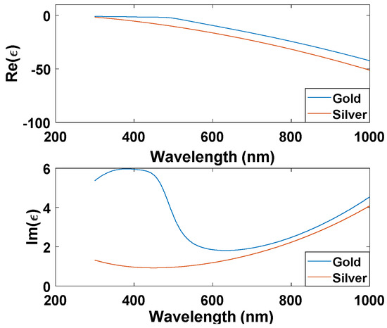 The model used to describe the permittivity of gold and silver is Drude-critical points model. The model can be given in Equation (1) as follows [42]