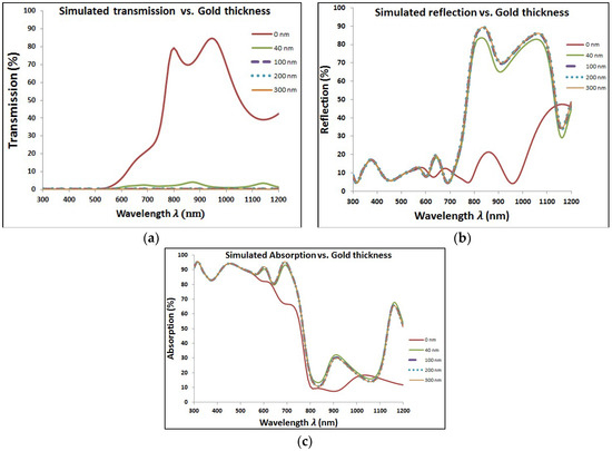 Optical characteristics for perovskite cell with different thickness of gold layer. These characteristics are (a) Transmission, (b) Reflection, and (c) Absorption.