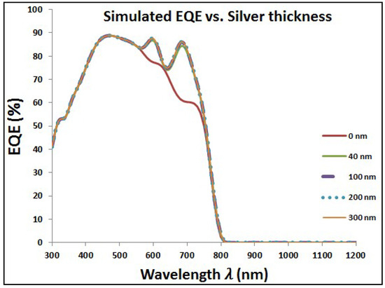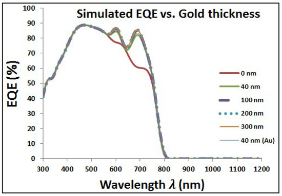 Figure 5 shows the optical characteristics of perovskite cell with added layer of Au NPs at different diameters. It can be noticed that the transmission is tremendously decreased with increasing the size of added Au NPs. However, the corresponding reflection and absorption have higher values with added Au NPs especially at wavelength around the plasmonic resonance wavelength. The resonance wavelength is varying from approximately ~550 to ~600 nm when the particle diameter is changing from 40 to 300 nm, respectively, for surrounding medium of refractive index of 1.5. Then, Figure 6 shows the improvement of EQE at wavelength range close to the plasmonic resonance frequency. The EQE enhancement can be explained due to the impact of reflected photoelectrons, which are trapped according to the added layer of plasmonic NPs, beside the optical enhancement of absorption due to plasmonic resonance of the added layer. There is a clear enhancement of EQE with lowest select size of Au NPs. By increasing Au NPs size, the EQE shows slight improvement with a saturation behavior at relatively higher NPs size up to 300 nm in diameter.