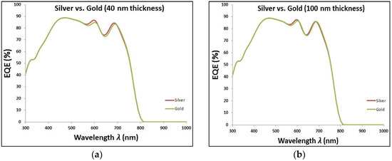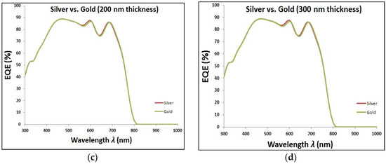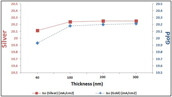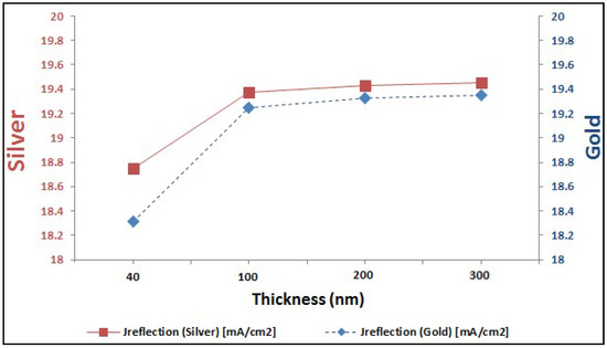 In last two sections, it is proved the enhancement of EQE of perovskite solar cells with added plasmonic NPs. Here, we are going to compare between both added plasmonic Au and Ag NPs. It can be shown from Figure 9 that Ag NPs enhance the EQE of perovskite cell slightly more than the added gold for different thicknesses of plasmonic layer. It can be explained through the better reflection capability that silver can offer compared to gold, as shown in Figure 10. This consequently leads to higher enhancement of short-circuit current in the case of silver compared to gold, as shown in the comparison figure at different layer thicknesses in Figure 11.