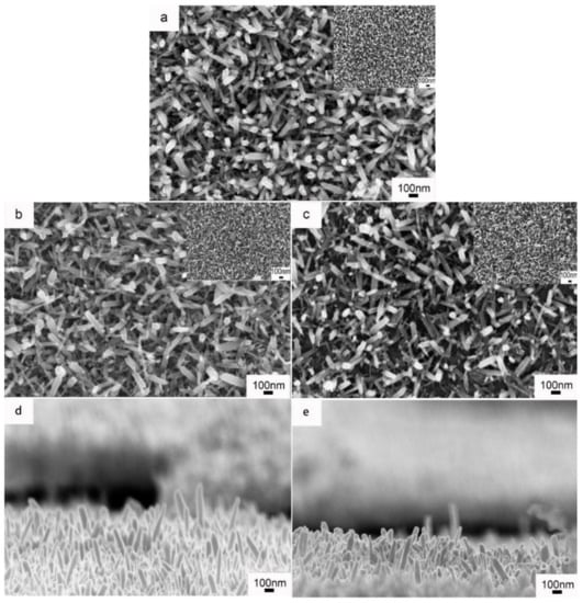 Scanning electron microscopy (SEM) images of WO3 nanorod arrays (WNRAs) film prepared with different molar ratios of Mo/W (RMo/W) (a) 0; (b,d) 1: 40; (c,e) 1: 20.