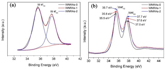 In addition, the energy dispersive spectrometry (EDS, Zeiss, Jena, Germany) spectra shown in Figure 2 indicate that Mo certainly existed in the prepared WNRAs film. Meanwhile, the peak intensity of W was much stronger than that of Mo, suggesting that WO3 dominated and the amount of Mo doped in WO3 was very small. The atomic concentrations of Mo in the obtained films are about 0.47% for WNRAs-1 and 0.96% for WNRAs-2 from the EDS spectra. To confirm that Mo was doped into the structure of the as-prepared WO3 nanorod, XPS measurements were performed to detect the chemical composition and valance state of WO3 prepared with different precursors. In the W4f core level spectrum shown in Figure 3a, the binding energies of the double peaks were 35.6 and 37.6 eV for W4f7/2 and W4f5/2, respectively [30,31,32]. The energy position of this doublet corresponds to the W6+ oxidation state, indicating that the valance state of W is still +6 with the doping of Mo. However, when the RMo/W of precursor increased from 1:40 to 1:20, the well-resolved split doublet peaks corresponding to W4f7/2 and W4f5/2 shifted to 35.7 and 37.7 eV, respectively (Figure 3b). This might be ascribed to the doping of Mo, leading to the shift of binding energy of WO3 [31,32,33,34].