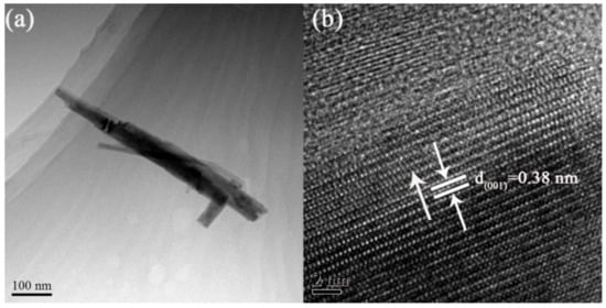 As the TEM image shows in Figure 5a, the obtained nanorods had a needle-like structure, an average diameter of 30–70 nm, and length of 550 nm. Moreover, it can be seen from the high-resolution (HR)TEM image (Figure 5b) that the lattice interplanar spacing was about 0.38 nm, which corresponds well to the (001) lattice plane of the hexagonal structure of WO3, indicating that the prepared WO3 nanorods grow along the (001) direction. It agrees well with the results shown in other literature [35,36,37], suggesting that the doping of Mo does not significantly change the growth orientation of synthesized WO3 nanorods.