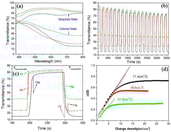 Electrochromic properties of WNRAs prepared at 180 °C for different times (black line: 4 h, red line: 5 h, green line: 6 h) (a) UV-vis transmittance spectra in colored and bleached states measured at ±3.0 V for 100 s; (b,c) switching time characteristics between the colored and bleached states measured at ±3.0 V with a wavelength of 660 nm; (d) coloration efficiency at 660 nm.