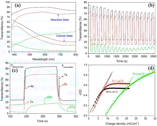 The results are shown in Figure 9d. It is depicted that the coloration efficiencies for WNRAs-4 h and WNRAs-5 h were 68.8 and 73.1 cm2/C, respectively. Generally, it is supposed that a high value of coloration efficiency means that the electrochromic material exhibits large optical modulation even when a small charge is applied. Figure 9a,b verified that the prolonging of the hydrothermal reaction time from 4 to 5 h improved the electrochromic performance, which is consistent with the result shown in Figure 9d. However, the coloration efficiency for WNRAs-6 h was decreased to 50.2 cm2/C when the hydrothermal time increased further from 5 to 6 h, indicating that the appropriate hydrothermal time for the fabrication of WNRAs with good electrochromic properties is 5 h.