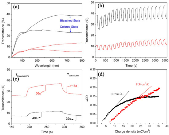 Electrochromic properties of WNRAs prepared at 190 °C for different times (black line: 4 h, red line: 5 h) (a) UV-vis transmittance spectra in colored and bleached states measured at ±3.0 V for 100 s; (b,c) switching time characteristics between the colored and bleached states measured at ±3.0 V with a wavelength of 660 nm; (d) coloration efficiency at 660 nm.