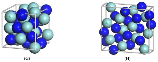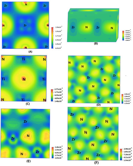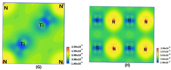 In order to show the bonding between atoms of different crystals more intuitively, difference charge density maps are shown in Figure 4. According to plot A and plot C, for TiN and ZrNwith space group Fmm, the charge densities between Ti and N are larger than that of Zr and N, which means that the effects between Ti–N are stronger. Meanwhile, ZrN with space group Fmm has stronger Zr–N bonds than ZrN with space group P63mc. So, the interatomic interaction of ZrN with space group Fmm is greater than that of ZrN with space group P63mc. For three different structures of Zr3N4, symmetry and asymmetry have little influence on the electronic properties. There are larger charge densities between Zr and N in Zr3N4 with space group Pna21 and Zr3N4 with space group Pnam than the other structure. So, there are stronger interactions between their atoms. The last two graphs (Figure 4G,H) represent the charge density of TiN with two different structures. Ti2N with space group P42/mnm has a larger charge density than Ti2N with space group I41/amdz. Therefore, the interatomic effect of Ti2N with space group P42/mnm is stronger.