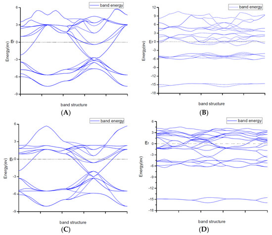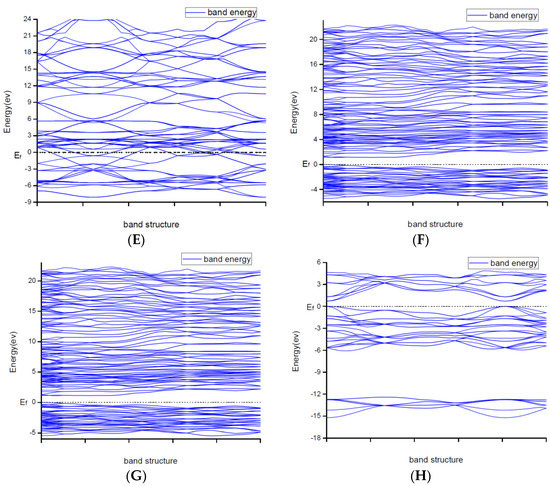 Band structures of (A) ZrN with space group Fmm; (B) ZrN with space group P63mc; (C) TiN; (D) Ti2N with space group P42/mnm; (E) Ti2N with space group I41/amdz; (F) Zr3N4 with space group Pna21; (G) Zr3N4 with space group Pnam; (H) Zr3N4 with space group I3d.