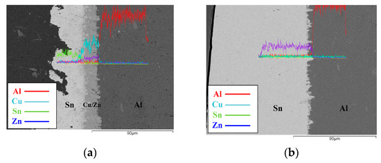 For the metal matrix in the PV ribbon, the 1050 Al-ribbon was used to substitute for the traditional Cu-ribbon (Table 1). The Zn and Cu metals were sequentially coated onto the Al-ribbon by electroless plating and electroplating, respectively, so that the Al-ribbon has a Cu surface (Cu∙Zn/Al). Then, the Sn layer was coated onto the Cu∙Zn/Al ribbon by electroplating (EP) and the hot-dipping (HD) method to acquire the Sn PV Al-ribbon (Sn/Cu∙Zn/Al). The EP (265 °C for 20 s) and the HD (320 °C for 15 s) PV ribbons were reflowed onto an Ag electrode on a Si solar cell. The detailed procedure described in our previous report [2], the peeling force test was executed to estimate the bonding reliability of applying Sn/Cu∙Zn/Al PV ribbons for Si solar cells. The biasing test was performed under a fusing current of 70% (12.6 A) for 72 h to investigate the series resistance, the interfacial diffusion and electrical migration behaviors of PV modules. The interfacial microstructures and element composition ratio were examined using an ultra-high-resolution field-emission scanning electron microscope (UHRFE-SEM, ZEISS, Jena, Germany) and an energy-dispersive X-ray spectrometer (EDS, ZEISS, Jena, Germany). An electron probe microanalyzer (EPMA, JEOL, Akishima, Japan) was used to analyze the interfacial diffusion behavior of the PV modules. The series resistances of the PV module structure (Ag/Sn/Cu∙Zn/Al) were calculated according to Ohm’s law.