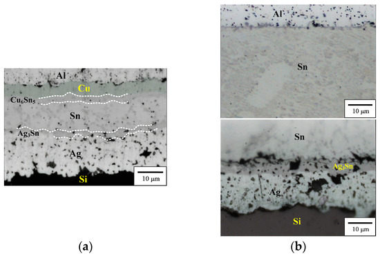 Figure 1 shows the interfacial images of the EP and the HD PV Al-ribbon (Sn/Cu∙Zn/Al). The thickness of the electroplated Sn layer is thinner than that of the hot-dipped Sn layer. Although the Zn layer in both the EP and HD PV Al-ribbon is not observed at the Cu/Al interface, it was detected in the Zn signal from the EDS analysis (Figure 1a). Note that the Cu layer does not exist in the HD PV Al-ribbon (Figure 1b), which is attributed to Cu metal being remitted into the molten Sn solder during the hot-dipping process. The Cu6Sn5 IMC grows at the Cu/Sn interface and the Ag3Sn IMC combines the PV Al-ribbon and Si solar substrate (Figure 2a). Compared with the EP PV module, the HD PV module has a thicker Ag3Sn IMC at the Sn/Ag interface, which is associated with a higher reflow temperature (Figure 2b).
