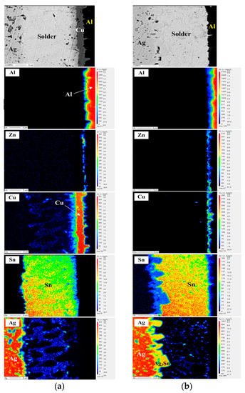 To determine the elemental (Al, Zn, Cu, Sn and Ag) distribution in the PV modules, EPMA was used to examine the interfacial structures (Figure 3). The electroless plated Zn layer is detected at the Cu/Al interface that can help to form an Al-ribbon with a Cu metal surface. As shown in Figure 3a, Ag atoms combined with Sn to form Ag3Sn IMC at the Ag/Sn interface, and also diffused into the electroplated-Sn layer to form the eutectic structure (β-Sn + Ag3Sn) (Ag signal diagram). The Cu6Sn5 IMC forms at Sn/Cu interface and a trace amount of Cu atoms diffused into the Sn layer along the grain boundaries of Ag3Sn (Cu signal diagram). Notably, the signal intensity of Cu is lower than that of Ag, because the Cu6Sn5 IMC layer can restrain Cu atoms diffusing into the Sn layer. In addition, the diffusion coefficient of Ag (241 cm2∙s) was higher than that of Cu (147 cm2∙s) and that also affects the contents of Ag and Cu diffused into the solder [14]. In Figure 3b, no obvious signal of the Cu layer is detected in the HD PV module structure, which is attributed to the Cu signal being covered by the Sn signal (Cu signal diagram). Note that the thickness of the Ag3Sn IMC layer in the HD PV module (6.86 µm) is thicker than the EP one (3.42 µm), which is attributed to the former having more solder. In addition, the series resistance of the EP and the HD PV modules was measured (Table 2). The series resistance of both of the PV modules was not obviously different. The series resistance does not substantially increase in the manufacturing process from the Al-ribbon to the Sn/Cu∙Zn/Al PV ribbon. The conductivity of the Al-ribbon itself dominates the series resistance of the PV module, indicating that the coated layer (Zn, Cu and Sn) has no significant influence on the conductivity of the PV module.