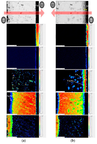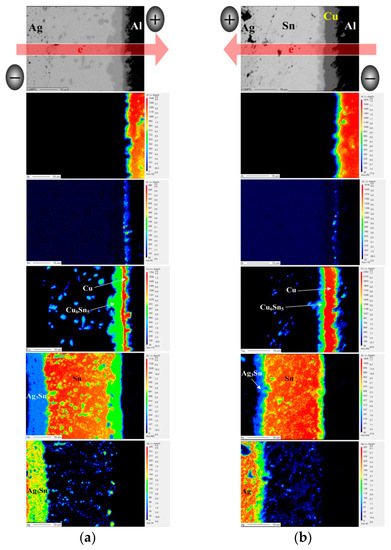 The bias aging test was performed to estimate the effects of photo-generated current on the series resistance of PV modules. The series resistance of all PV modules increased after biasing for 72 h (Table 3). This result is attributed to a bias-induced Joule heat and an electromigration promoting the growth of Cu6Sn5 and Ag3Sn IMCs at the interface in the module structure. The elemental distribution of interfacial structures in the EP PV module with a bias duration of 72 h is shown in Figure 4. According to the electron flow path, the electron flow from the Al-ribbon to the Ag electrode is defined as “Al-direction”; the opposite is defined as “Ag-direction”. After Ag-direction bias aging (Figure 4a), the Cu6Sn5 and Ag3Sn IMC layers significantly increased compared to that of the unbiased EP PV module (Figure 3a). The electron flow from the Ag electrode to the Al ribbon resulted in an accumulation of Cu6Sn5 near the positive electrode. A direct current is passed through the PV module structure, which drives the atoms by electro-transport and thermo-transport effects [15]. The flux equation for the given module structure can be written