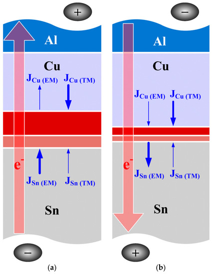 where Di is the isothermal diffusion coefficient, Ni is the mole fraction of the atom, F is Faraday’s content, is the effective charge and E is the electrical field. For the Cu atom, is the chemical potential, which is the main driving force for the growth of Cu6Sn5. The electromigration force () can be ignored in the Sn–Cu system. However, the flux of Sn electromigration (JSn (EM)) is the main driving force that affected the diffusion of the Sn atom. The flux of Cu thermomigration (JCu (TM)) is not in the same direction as that of the JSn (EM) (Figure 5a). Therefore, a thermomigration and an electromigration force push Cu and Sn atoms, causing the Cu6Sn5 accumulation to increase. A large number of Sn atoms reacted with Cu atoms, so the Ag atoms were carried to fill the position where Sn was consumed, resulting in an increment of the Ag3Sn IMC layer. In addition, the existing Ag and Cu in the Sn solder matrix will precipitate to form a large number of eutectic structures (β-Sn + Ag3Sn + Cu6Sn5), which deteriorated the module conductivity. As shown in Figure 4b, the kinetic energy of IMC growth in the Al-direction is smaller than that in the Ag-direction. The driving forces of JCu (TM) and JSn (EM) are in the same direction, decreasing the kinetic energy of the Cu6Sn5 growth (Figure 5b). The JSn (EM) reduced the amount of Sn atoms reacting with Cu atoms to form the IMC. Less Ag atoms diffused toward the negative electrode, reducing the growth behavior of the Ag3Sn IMC. Compared with Al-direction biasing, the Ag-direction biasing led to more IMC growth, and, thus, the Ag-direction biased PV module having a higher series resistance.