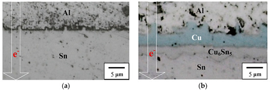 Growth mechanism of Cu6Sn5 intermetallic compound (IMC) in the EP PV module at the Cu/Sn interface after (a) Ag-direction and (b) Al-direction biasing.