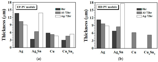 Variations in Ag, Ag3Sn, Cu and Cu6Sn5 thickness of (a) the EP and (b) the HD PV modules under various bias conditions.