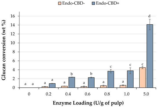 Glucan conversion from hydrolysis of wood pulp with endoglucanases. Wood pulp was subjected to enzyme hydrolysis at various loadings of endoglucanases with (Endo-CBD+) or without (Endo-CBD−) a cellulose-binding domain. Since endoglucanases generate long/short chain sugars rather than monosaccharides (i.e., glucose), quantification of the sugars released from wood pulp into the supernatant through endoglucanase action was achieved through a secondary enzymatic hydrolysis that enabled complete hydrolysis of sugars to glucose monomers. Columns labelled with different letters indicate means that are statistically different at a 95% confidence level.