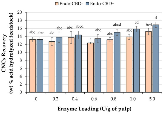 Overall, the improvements (1.2× and 1.3× from Endo-CBD− and Endo-CBD+ treatments, respectively) in CNC recovery from the acid hydrolysis process may have a notable impact in reducing the amount of acid and reagents, energy, and time requirements of subsequent CNC purification processes [32].