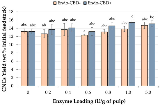 Cellulose nanocrystals (CNCs) recovered following acid hydrolysis of untreated wood pulp or the solid residue remaining after treatment with various amounts of endoglucanase with (Endo-CBD+) or without (Endo-CBD−) a cellulose-binding domain. CNC yields were determined by dividing the mass of CNCs obtained by the mass of the material subjected to acid hydrolysis (8 g). Columns labelled with different letters indicate means that are statistically different at a 95% confidence level.