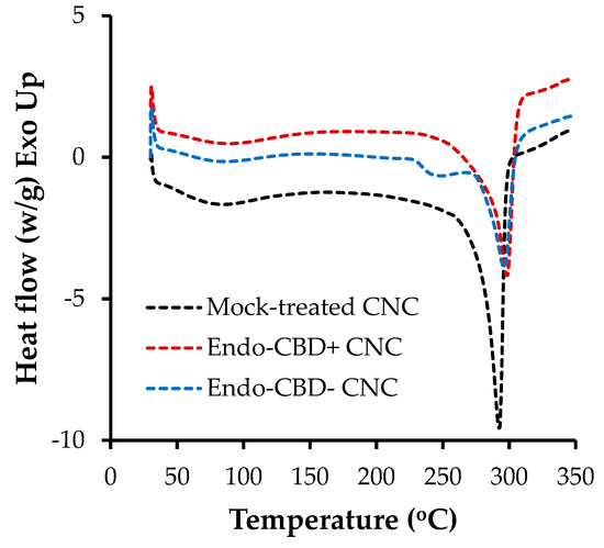 The heat transition curves generated from DSC study of the CNCs samples are shown in Figure 6. All the curves showed an initial drop between 50 °C and 150 °C, which was likely due to moisture loss. For all three CNCs samples, degradation commenced at roughly 290 °C to 300 °C, as evidenced by the large thermal event observed in the DSC thermograms at this temperature range. Similar DSC profiles were also reported in other studies in the literature [42,44,45]. There was no difference in the thermal transition temperatures between the CNCs generated from the mock and enzyme-treated wood pulp. This further confirms that the endoglucanase treatment in the present study did not result in changes to the CNCs generated through subsequent acid hydrolysis.
