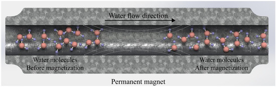 Magnetized water has different mechanical, electromagnetic, and thermodynamic properties compared to regular tap water [8]. Due to these specific properties, the use of magnetized water has been increasing in different applications such as in industrial, environmental, medical, and agricultural fields due to the development of magnetic devices. The magnetization procedure of water is a simple method without using extra energy when a permanent magnet is used. The permanent magnet can be installed on a previously established water tube system, resulting in no further energy requirements for water magnetization [10]. Magnetized water is obtained when water passes through a permanent magnetic field with a constant speed. When that happens, some definite changes occur in its molecular characteristics. The molecules of regular tap water are not separated from each other due to the existence of hydrogen bonds. They tend to attach to each other, forming clusters. As regular tap water passes through a permanent magnetic field, the size of these clusters and the number of grouped molecules decreases [10,11,12]. Consequently, the activity of the water molecules increases. Toledo et al. [11] reported that the magnetic fields weakened the intraclusters’ hydrogen bonds, breaking the larger clusters, forming smaller clusters with stronger intracluster hydrogen bonds. The effect of the magnetic field in enhancing the hydrogen bonding was confirmed by Inaba et al. [13] and Cai et al. [14]. The effect of the magnetic field on water molecules is schematically shown in Figure 1.