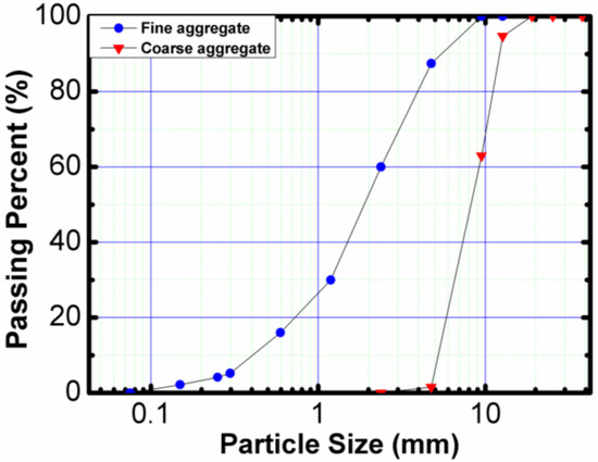 The coarse aggregates used in this study were crushed limestone, and the fine aggregates were river sands acquired locally. The physical properties of the fine and coarse aggregates and their particle size distribution are shown in Table 2 and Figure 2, respectively.