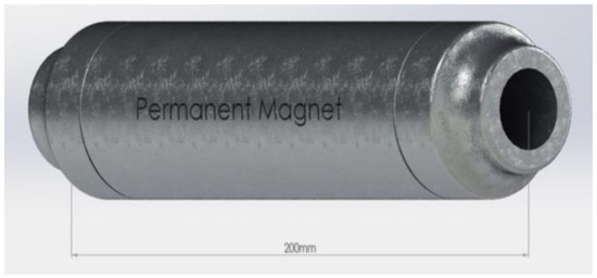 Regular tap water was used for mixing. In order to magnetize regular tap water, a permanent magnet with a magnetic strength of 0.65 T was used. The magnet has a length of 200 mm, an internal diameter of 32 mm, and an external diameter of 55 mm. The permanent magnet used in this study is schematically shown in Figure 3.