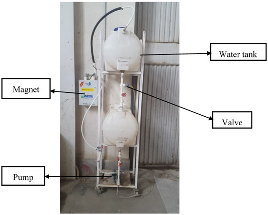 In order to prepare the magnetized water, regular tap water was circulated through the permanent magnet at a constant speed and water flow of 2.25 m/s 10, 20, 40, and 80 times. One end of the magnet was connected to a pump, and the other end was connected to a water tank, as shown in Figure 4.