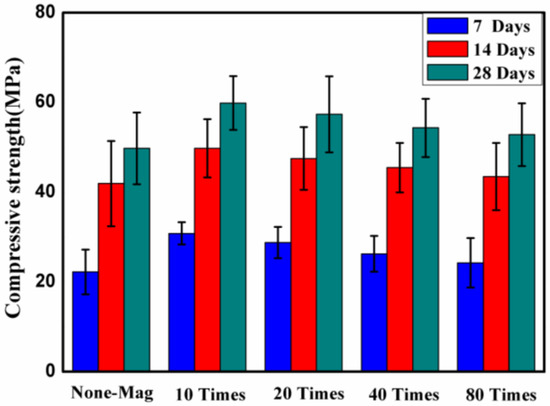 Figure 5 also shows that, as the curing age grows, the compressive strength of all of the specimens increases, as expected, but the rate of increase varies, as reported previously [18]. The results showed that for specimens prepared with magnetized water, as the number of times that water passes through the permanent magnetic field increases, a higher rate of increase is obtained. In addition, at an early curing age, the compressive strength of specimens with regular tap water increases at a higher rate than that of specimens with magnetized water.