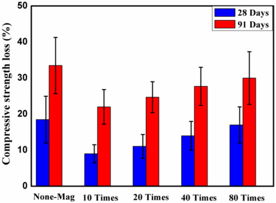 Figure 9 shows that the compressive strength of all of the mixes decreased after 28 and 91 days of exposure to H2SO4 solution, but the rate of decrease varied for different mixes. For all of the concrete mixes, the maximum loss in the compressive strength of concrete mixes was observed after 91 days of exposure to H2SO4 solution, as expected. The reduction in the compressive strength of the mixes was likely due to dimension decrements and the loss of surface stiffness [35]. The reduction in compressive strength of the mixes may also be attributed to the reaction of sulfuric acid with Ca(OH)2 [33]. Allahverdi and Škvara [36] reported that sulfuric acid attack causes the extensive formation of gypsum in the regions close to the surfaces, and tends to cause disintegrating mechanical stresses that ultimately lead to spalling and exposure of the fresh surface. The results also showed that, regardless of the number of times that water passes through the permanent magnetic field, the specimens with magnetized water had a lower loss in compressive strength compared with the ones with regular tap water. This may be attributed to the more compact and dense microstructure of the mixes with magnetized water, which reduced the effective pores in the concrete surface, and hence reduced its permeability. The lower loss in the compressive strength of the specimens with magnetized water may also be related to the lower mass loss of the specimens with magnetized water compared to the ones with regular tap water. The highest loss in compressive strength of the mixes after 91 days of immersion in H2SO4 solution was registered for mix No. 1. For specimens with magnetized water, the compressive strength percentage loss decreased as the number of times that water passed through the permanent magnetic field reduced. After 91 days of exposure, differences of 11.5%, 9%, 6%, and 3.5% in percentage loss were noted between mix No. 1 and mixes No. 2, No. 3, No. 4, and No. 5, respectively. These results are in agreement with the mass loss results.