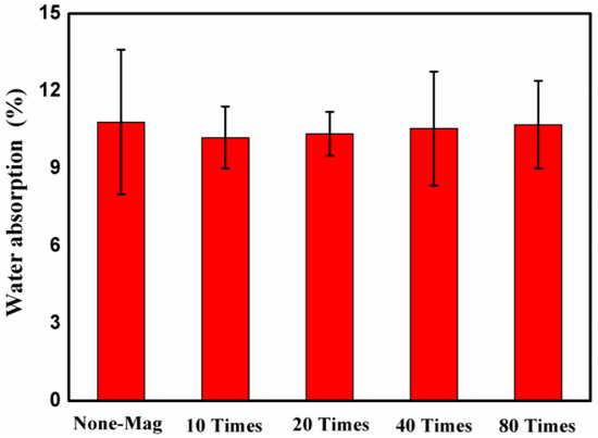 The water absorption of the mixes prepared with regular tap water and magnetized water after 28 days of curing in lime-saturated water is shown in Figure 10. Each bar of the plot represents the mean value of five independent measurements. As seen in Figure 10, the water absorption of all of the mixes with magnetized water was lower than that of the specimens with regular tap water.