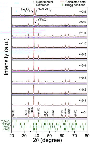 In Figure 1, for a higher concentration of Nd3+ (x ≥ 2), we observed the formation of orthoferrite phases, which included: yttrium orthoferrite, YFeO3, ICSD #2101386 (Pnma); neodymium orthoferrite, NdFeO3, ICSD #280090 (Pnma); and hematite, Fe2O3, ICSD #5910082 (R-3cH). The formation of the orthoferrite phases instead of a garnet phase is due to the limit of the solubility of neodymium into the YIG structure. Despite the formation of YFeO3 and Fe2O3 phases, for the Nd concentration x = 2, it is possible to say we extended the solubility limit for neodymium doping by means of assisted mechanical milling compared to the results reported by T. Arun et al. [25] found that the maximum solubility of the Nd3+ in NdxY3−xFe5O12 is x = 1.0. This increase in the solubility limit is attributed to the synthesis method, because the milling process produces an increase in the free energy of the system. The energy increase is mainly due to the storage of energy by means of lattice defects introduced by mechanical deformation and interfacial energy. Therefore, the particles become mechanically activated for chemical reactions during the annealing processes. In addition, Figure 1 shows the Rietveld refinement of the NdxY3−xFe5O12 (0 ≤ x ≤ 2.5) samples, with the results confirming the successful synthesis of pure garnet phase for x < 2.