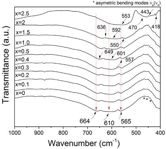 Figure 2 shows the FT-IR transmittance spectra at room temperature in the wavenumber range of 1000–400 cm−1 for the NdxY3−xFe5O12 samples (0 ≤ x ≤ 2.5) milled for 5 h and annealed at 1373 K for 2 h. As can be observed, for the non-doped sample (x = 0), the FT-IR spectra shows three intense vibrations corresponding to the tetrahedral sites, Fe–O bond and υ3 (664, 610, and 565 cm−1). Furthermore, a strong band at 400 cm−1 attributed to the isolated octahedral characteristic of the YIG was identified. The results are consistent with the space group Oh10 (Ia3d) of YIG, which exhibits 17 triply degenerate T1u modes that are active in the IR region [4,10]. Besides, there are no significant changes in bands and intensity for the absorption bands for doped samples (0.1 ≤ x ≤ 2.0).