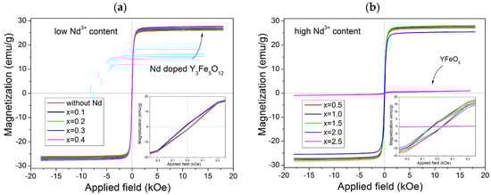 In order to describe the magnetic behavior of the synthesized materials, Figure 3 displays a field-dependent magnetization M(H) data measured at room temperature (magnetic hysteresis loops) with x = 0–0.4 in Figure 3a and x = 0.5–2.5 in Figure 3b. Two different behaviors are observed. The first shows a ferrimagnetic order where the specific magnetic saturation (Ms), which is around 26 emu/g, is reached by applying a magnetic field close to 2 kOe for x ≤ 2 (Figure 3a). The second shows a weak ferrimagnetic material for x = 2.5 with a specific magnetization of 1 emu/g (Figure 3b). These behaviors are attributed to the different crystal structures observed in XRD patterns in Figure 1 as there was a garnet structure for x ≤ 2 and orthoferrite structure for x = 2.5. Besides, it can be observed that the value of specific magnetization for x ≤ 2 is high, which was attributed to the interactions of super exchange of the (24d) sites. These sites are not influenced by the Nd3+ and instead depend on the angles between iron ions. However, the reduced magnetizations in 16a sites can be attributed to the lower strength of the Fe–O bond in tetrahedral sites. The substitution of Y3+ by Nd3+ improved the magnetic order of the structure by ferromagnetic coupling with the total magnetic moment of iron. However, when x = 2.5, there is a marked change in behavior.