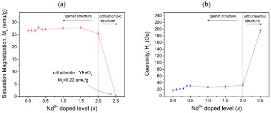 In order to analyze the magnetic hysteresis loops shown in Figure 3, the variation of specific saturation magnetization (Ms) and coercivity (Hc) versus neodymium content (x) is presented in Figure 4. As observed, we obtained 17.5 Oe of coercivity for the non-doped sample, which is slightly lower than samples synthesized by other methods [11,12,13,14]. This result can be due to the lower crystallite size achieved by high-energy ball milling and the formation of a complete solid solution of yttrium iron garnet. In addition, we detected a systematic increase in the coercivity with an increase in neodymium concentration. This is attributed mainly to the microstrain in crystal structure of YIG since crystal deformation and grain boundaries are related to the movement of the domain wall. Thus, additional energy is required in the form of a larger applied field to overcome the decrease in the energy of the wall and to release it from grain boundaries. This results in an increase in the values of Hc for the multi-domain structure, where the regions of uniform magnetization are separated by domain walls [3].
