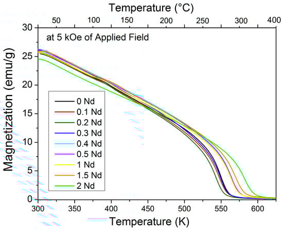 Finally, we evaluated the effect of adding Nd3+ ion to the YIG crystal structure and its relationship with the Curie temperature, with the results shown in Figure 6. For temperatures higher than Tc, a complete random orientation of the magnetic moments takes place (paramagnetic state), which results in zero magnetization. For this reason, the increase in Tc can be explained by the increasing concentration of Nd3+ ions due to the positive contribution of Nd ions that increased the magnetic moment of samples.