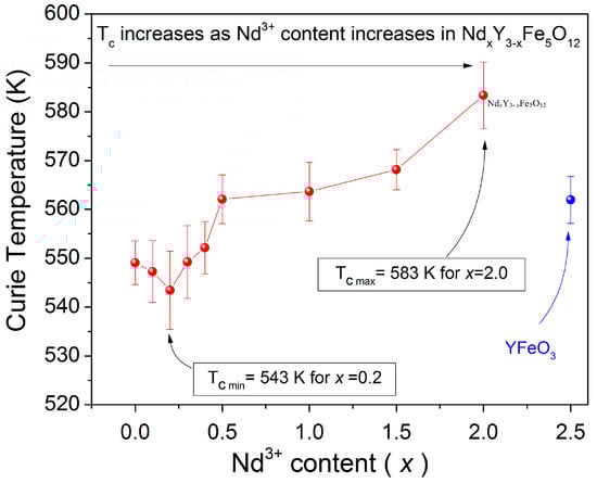 The Tc of the un-doped sample obtained was 549 K, which is consistent with other authors [4,15]. By increasing the Nd3+ content, an increase in Tc was found as Tc increased from 549 K for the non-doped YIG to 583 K for doped sample with x = 2.0. Hence, this can be explained by the major contribution of the 5d orbitals of Nd3+, which is larger than the 6s. As previously mentioned, Nd3+ increased the magnetic moment and enhanced the Tc (up to 583 K) for high contents of neodymium (x = 2).