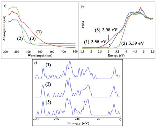 The solid state UV-Vis absorption spectra of studied compounds were recorded with an integrating sphere fitted spectrophotometer at room temperature (Figure 2a). MgO was used as a standard reference. Figure 2b shows the plot of Kubelka–Munk (K–M) function versus light energy, i.e., K = f(hν) where K = (1 − R)2/2R and R is reflectance that was used for the optical band gap determination [40,41].