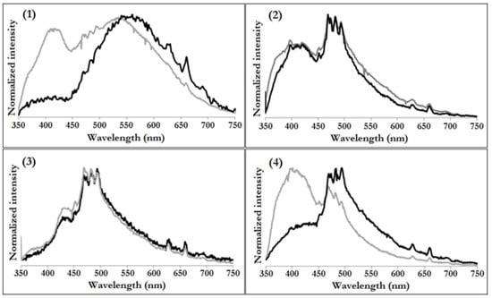 Solid state photoluminescence spectra (1–4) of (Ti4O2(OiBu)10(O2CR’)2) (R’ = C13H9 (1), PhCl (2), PhNO2 (3), PhNH2 (4)) respectively (black plots) collected by 330 nm excitation at room temperature compared to spectra of corresponding acids (grey plots).