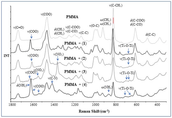 Raman spectra of poly(methyl methacrylate) (PMMA) and PMMA–titanium oxo-clusters (TOCs) composites. Arrows indicate the bands, derived from (1)–(4) complexes.