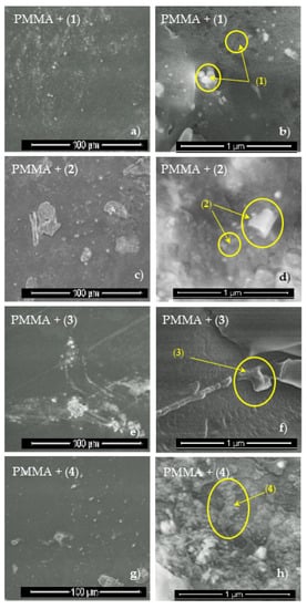 SEM images of PMMA + TOCs composites in different magnifications (1) (a,b), (2) (c,d), (3) (e,f), end (4) (g,h).