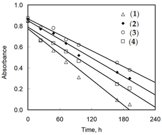 Changes in absorbance of methylene blue (MB) solution with time after addition of PMMA foil with a selected complex. MB = 1 × 10−5 M, PMMA foil surface = 0.64 cm2, T = r.t., l = 1 cm. Presented values are after blind test correction (R2 = 0.9701 (1), 0.9876 (2), 0.9896 (3), 0.9769 (4)).