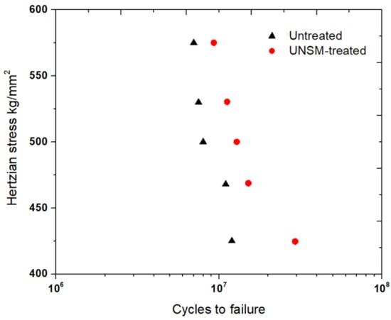 Comparison in S-N (stress-number of cycles) data of the untreated and UNSM-treated specimens at various contact stress levels.