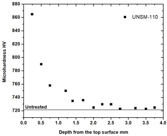 Variation of the micro-Vickers hardness value of the UNSM-110 specimens as a function of the depth from the top surface.