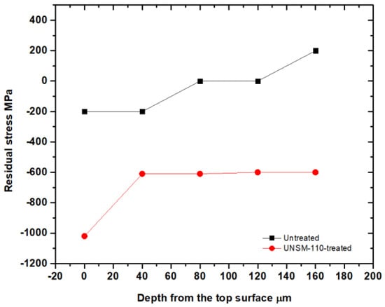 Variation of the compressive residual stress value of the untreated and UNSM-110-treated specimens as a function of the depth from the top surface.