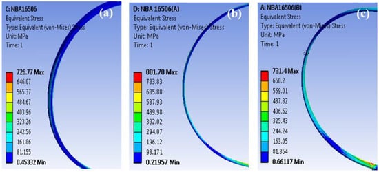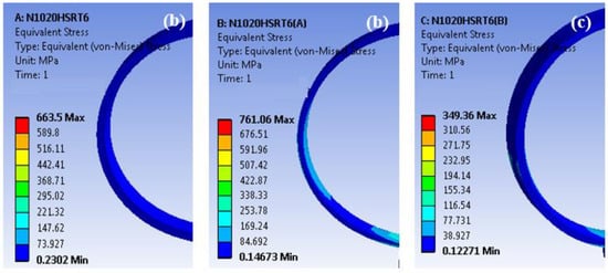 ANSYS equivalent stress result of roller bearings of the outer ring: (a) untreated ring, (b) UNSM-A ring, (c) UNSM-B ring.