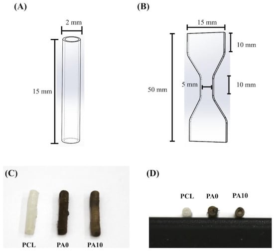 Schematic drawing of (A) the conduit and (B) the dumbbell-shaped sample used in the mechanical testing. The (C) top- and (D) side-view photograph of dECM/PDA-coated conduits.