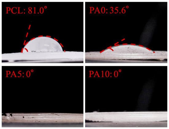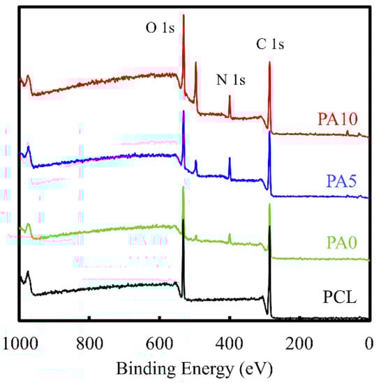 The deposition of dECM/PDA on PCL is also supported by the XPS high-resolution spectra (Figure 3). The photoelectron peaks of the PA0, PA5, and PA10 appear, along with the emergence of N1s at 400 eV. After PDA deposition, the amount of nitrogen was much greater than those seen with the pure PCL that indicated PDA coated on the PCL surface. In addition, the increase of the N–C=O component at 289.0 eV indicated the introduction of maleimide and ECM bonds on the surface [27].