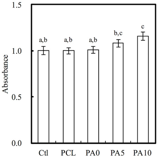 Cellular adhesion on the various conduits was measured using Prestoblue assays (Figure 7A). After 3 h of cell culture, the absorbance of both PA5 and PA10 was significantly higher than that of Ctl, PCL and PA0 (p < 0.05). However, there were no significant differences between PA5 and PA10, and there were also no significant differences between Ctl, PCL and PA0. The absorbances of the dECM/PDA-coated PCL conduits increased exponentially with the amount of dECM coatings, with PA10 having an increment of approximately 40% after 3 h of culture. However, there was a decrease in the absorbance of PCL as compared to Ctl and the rest of the groups. Similarly, there was a decrease in the absorbance of PCL after 6 h of culture, but there remained no significant differences between PCL and Ctl (p > 0.05). It was also worthy of note that after 6 h of culture, all dECM/PDA-coated PCL conduits had significantly higher absorbances than PCL and Ctl. Degree of cellular adhesion is commonly used as a determinant factor in predicting subsequent levels of cellular proliferation and differentiation. Combinations of natural proteins or polysaccharides with synthetic polymers have commonly been reported to enhance cell adhesion and proliferation in comparison to neat polymers [34].