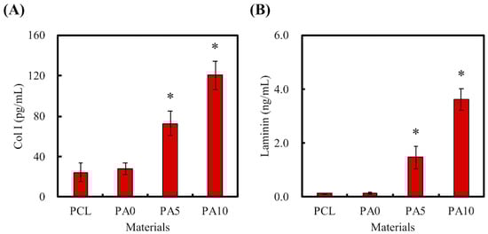 (A) Col I and (B) laminin were secreted by dECM/PDA-coated PCL conduits after immersion in DMEM for 3 h. * indicates a significant difference (p < 0.05) compared to PA0.