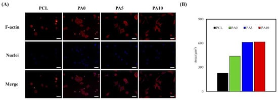 To further supplement the above findings, F-actin stains and DAPI immunofluorescence images were used to visualize and observe cellular morphology after adhesion and spreading. As seen in Figure 8A, RSCs on the neat PCL conduits were in a small spherical shape, which was a clear indication of a typical non-adhered morphology. In comparison, cells on PA10 exhibited a flattened and elongated morphology, with F-actin stains clearly indicating cell membrane proteins and widened spreading. The areas of red cells on PCL, PA0, PA5, and PA10 are 230.25 µm2, 438.73 µm2, 611.46 µm2, and 613.91 µm2, respectively (Figure 8B). In addition, there was an increased number of cells when compared to neat PCL conduits. These data further supported the findings above, in which that surface modification with dECM contributed significantly to the fabrication of functional PCL conduits that were non-cytotoxic and were able to enhance cell adhesion, which would further influence cell proliferation and differentiation.